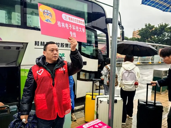 公交公司党委紧扣春季开学返校高峰,精准对接高校出行需求,开通桂林站、桂林北站至各高校的定制公交专线,实现“车站到校门口”一站式直达。40余名党员志愿者冒雨坚守车站、公交站点等关键点位,为返校学子提供线路咨询、行李搬运、秩序维护等志愿服务,在阴雨天气为学子搭建起安全便捷的 “暖心通道”。
